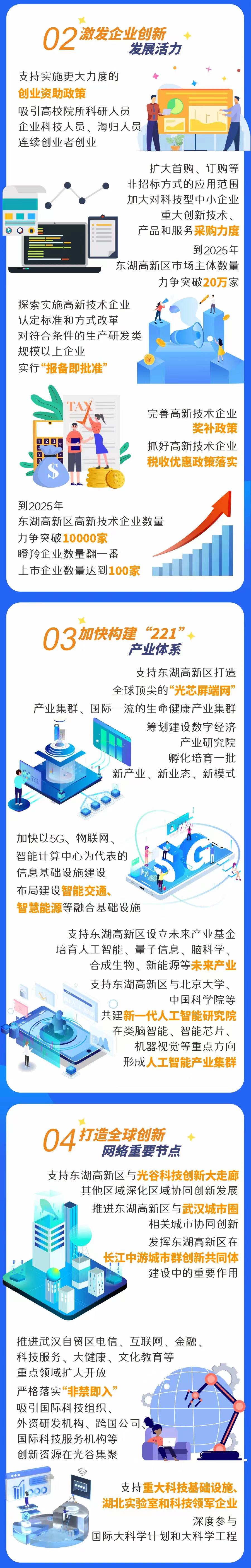 方案要求,加快推進以東湖科學城為核心的光谷科創大走廊建設,大力創建湖北東湖綜合性國家科學中心和武漢國家科技創新中心,為國家高水平科技自立自強提供戰略支撐。加大對東湖高新區規劃建設、產業發展、創新資源配置的統籌力度,增強東湖高新區對全市經濟的輻射帶動作用,以推動全市全域自主創新發展。